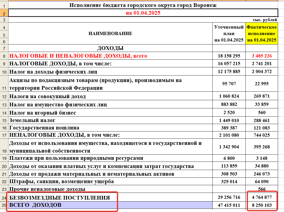 скриншот документа мэрии Воронежа, доходная часть городского бюджета в январе - марте 2025 года.