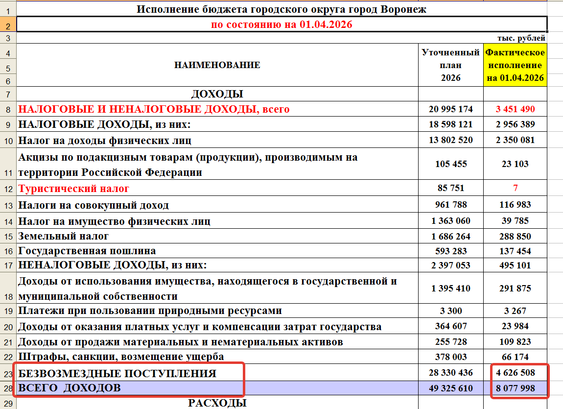 «Новинка» не помогла такому важному показателю, как собственные доходы бюджета, налоговые и неналоговые. Они уменьшились по сравнению с январем-мартом 2025 года: тогда показатель был 3 млрд 485 млн, а сейчас – 3 млрд 451 млн. Сокращение вроде бы и небольшое – минус 36 млн рублей – но тревожное. По факту - нет роста собственных доходов у города Воронеж.