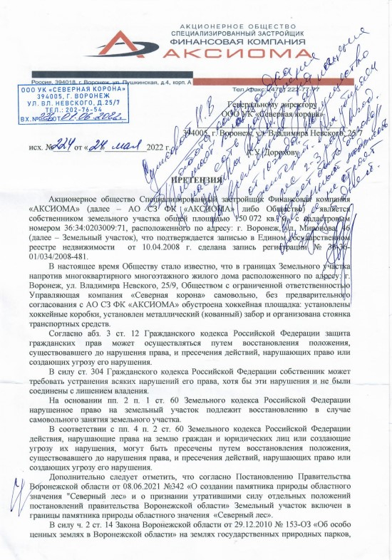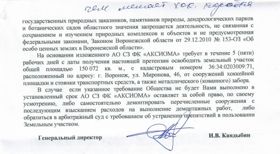 Но суть в том, что «Аксиома» заявила о незаконном строительстве забора, хоккейной коробки и даже стоянки на территории парка «Северный лес», где компания владеет участком земли. И под благовидным предлогом, мол, в природном памятнике не должно быть никаких самостроев, отвела воронежцам пять дней на демонтаж самопального спортивного объекта.