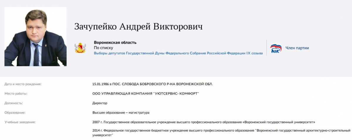 На прошлой неделе на сайте предварительного голосования по потенциальным кандидатам в Госдуму от «Единой России» неожиданно появился уроженец Слободы Бобровского района, депутат воронежской Гордумы Андрей Зачупейко. Самое любопытное, что он предлагает себя в качестве кандидата по единому партийному списку. Учитывая фамилии тех, кто по нему намерен пройти в парламент страны, получается, что Зачупейко решил подвинуть в сторону бывшего губернатора области Алексея Гордеева и действующего депутата Госдумы Евгения Ревенко.