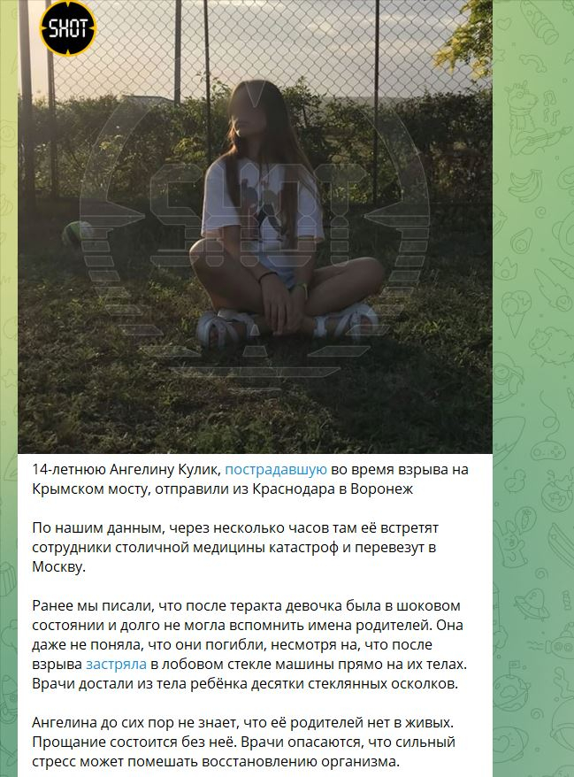 14-летнюю Ангелину Кулик, пострадавшую во время взрыва на Крымском мосту, отправили из Краснодара в Воронеж. Об этом рассказали в телеграм-канале Shot сегодня, 19 июля.