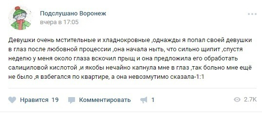 – Девушки очень мстительные и хладнокровные, – написал он. – Однажды я попал своей девушке в глаз после любовной процессии, она начала ныть, что сильно щипит, спустя неделю у меня около глаза вскочил прыщ, и она предложила его обработать салициловой кислотой и якобы нечаянно капнула мне в глаз. Так больно мне ещё не было, я взбегался по квартире, а она невозмутимо сказала - 1:1