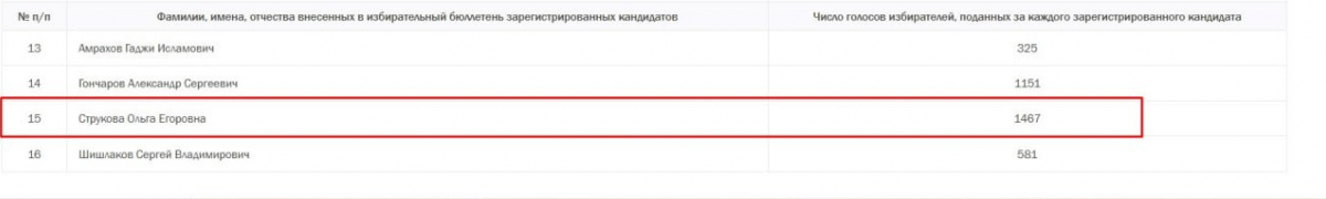 Глава мегашколы побеждает на выборах в округе №23. Она набрала 1467 голосов избирателей, оторвавшись от ближайшего конкурента на 300 голосов. Главным соперником Струковой должен был быть депутат гордумы от партии «Справедливая Россия – За правду» Артем Рымарь, однако ТИК Центрального района отказал ему в регистрации по одномандатному округу №23.