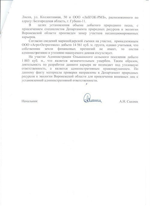 Глава регионального управления МВД Александр Сысоев сообщил, что песок незаконно добывали на участках земли, принадлежащих ООО “Агро-Острогожск” и Ольшанскому сельскому поселению. В первом случае добыто 14 561 куб.м. грунта, однако, “учитывая, что собственник земли финансовых претензий не имеет, то состав административно и уголовно наказуемого деяния отсутствует”. На участке Ольшанского сельского поселения добыто 1 883 куб. м., что “является незначительным ущербом”.