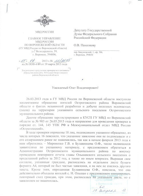 Сотрудник департамента природных ресурсов Воронежской области М.В. Шишкин произвел отбор и сдал песок на лабораторный анализ. Однако, полиция Острогожска так и не получила результаты экспертизы и на этом основании заместитель начальника МВД “Острогожский” подполковник Ю.А. Башкатов утвердил постановление об отказе в возбуждении уголовного дела.