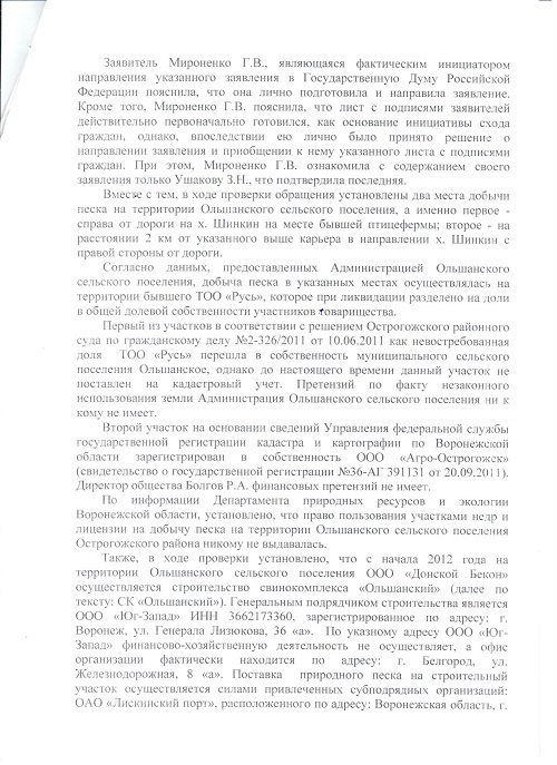 Старший лейтенант полиции МВД “Острогожский” А.С.Болдырев в ходе проверки установил, что “с начала 2012 года на территории Ольшанского сельского поселения ООО “Донской Бекон” осуществляется строительство свинокомплекса “Ольшанский”. Генеральным подрядчиком строительства является ООО “Юг-Запад”. Директор “Юг-Запад” Ю.А.Савенков пояснил, что песок для стройки приобретался у ОАО “Лискинский порт” и ООО “ЛебГОК-РМЗ”.