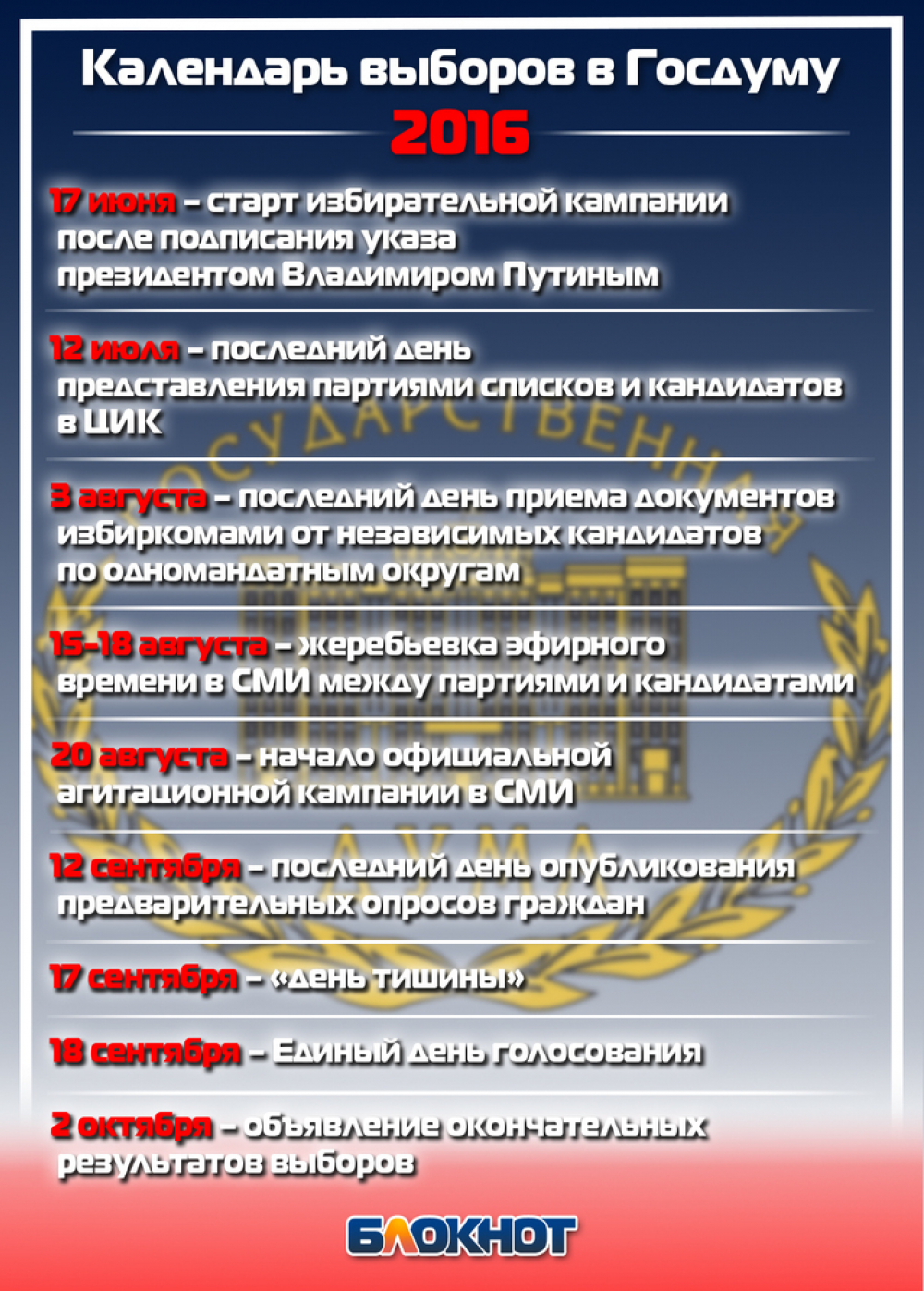 Вчера, 20 июня Центризбирком утвердил календарь кампании по выборам депутатов Госдумы, которая завершится единым днём голосования 18 сентября.