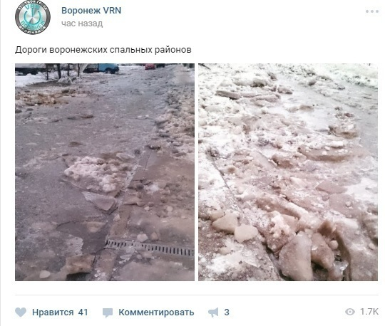 "Это еще цветочки, на Московском проспекте на машине едешь, как на фигурном катании", "Зато и мэр, и губернатор новые!", "А во дворах ходить вообще невозможно. Кое-как полезешь, боишься упасть.Пожилых жалко, им по таким буграм обледенелым не пройти, ноги переломают", "Скоро весна, само все растает", – написали воронежцы.