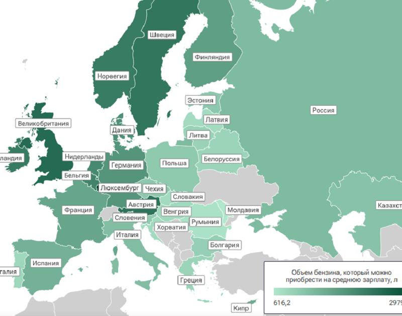 Страны, в которых бензин доступнее, чем в России: Люксембург, Великобритания, Австрия, Швеция, Ирландия, Норвегия, Бельгия, Нидерланды, Дания, Германия, Финляндия, Франция, Кипр, Испания.