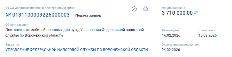 В системе Госзакупок появился тендер на поставку двух автомобилей для нужд управления Федеральной налоговой службы по Воронежской области.