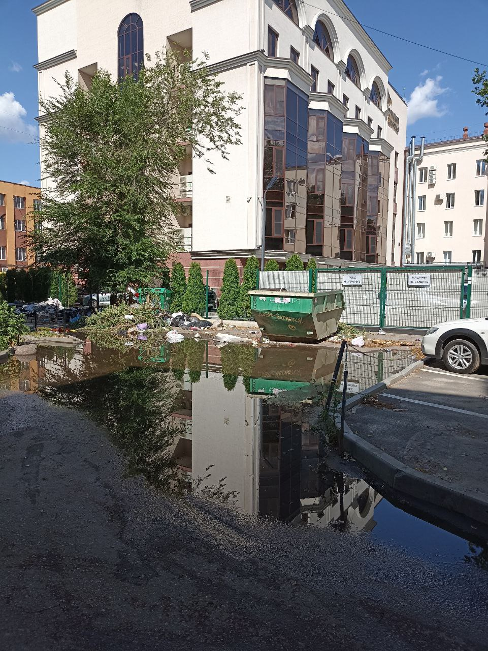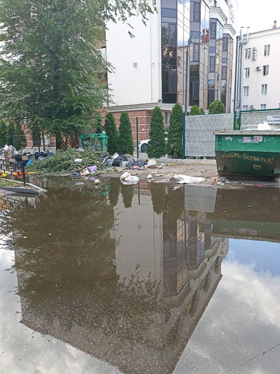Занимательно, что выбросить мусор в таких условиях не представляется возможным. «Озеро», как можно заметить по фото, разлилось прямо у контейнера, который одинехонько стоит на островке суши. Разбросанные ветки, пакеты и прочие отходы говорят о том, что про место забыли. Или близки к тому, чтобы забыть.
