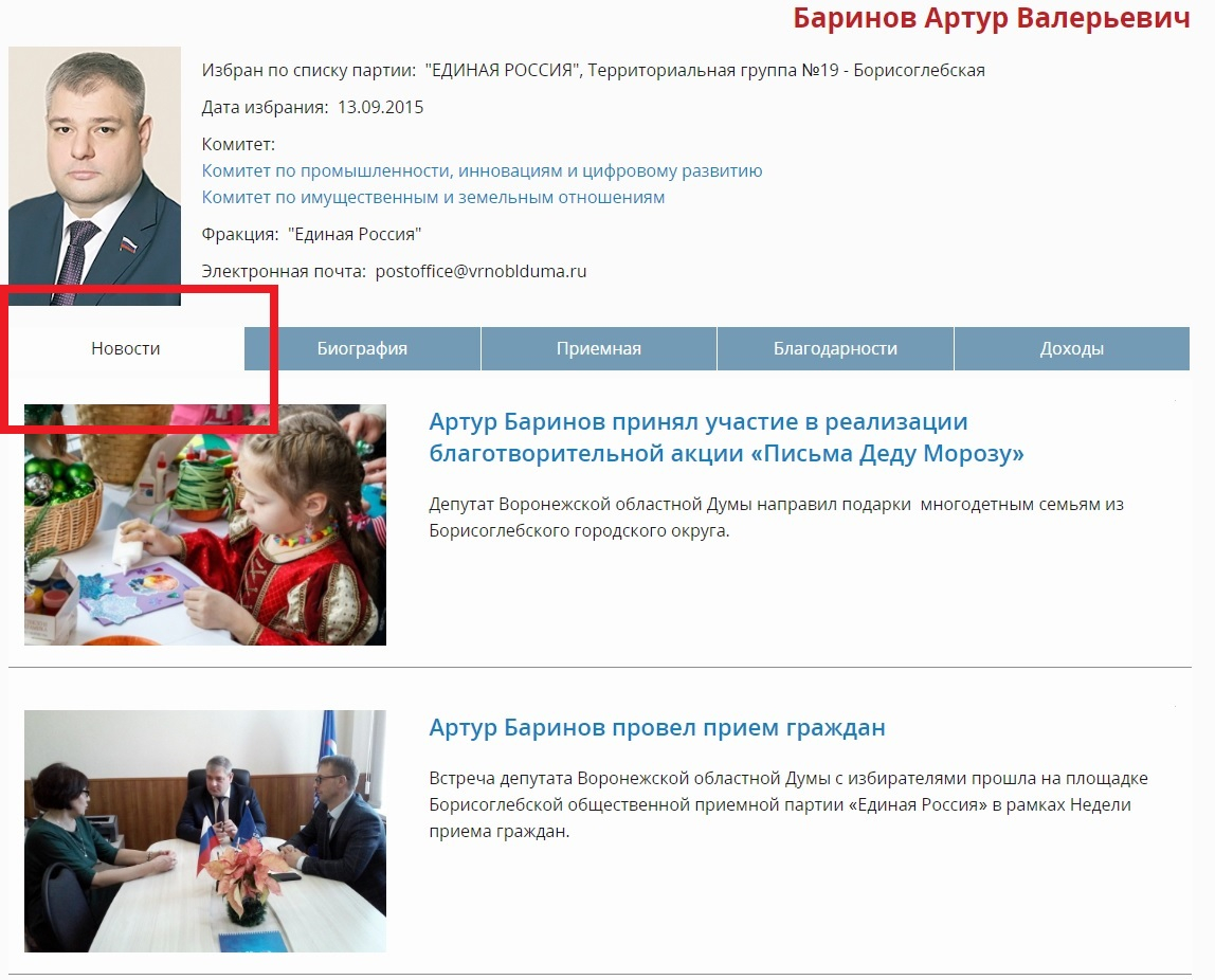 Подведем итог. За 4,5 года пребывания в кресле депутата Воронежской областной Думы Артур Баринов удостоился десятка новостей о своей работе. Получается, что все его достижения на официальном сайте парламента за прошедшие полторы тысячи дней – это приемы граждан, заседания комитетов, раздача оргтехники и новогодних подарков.