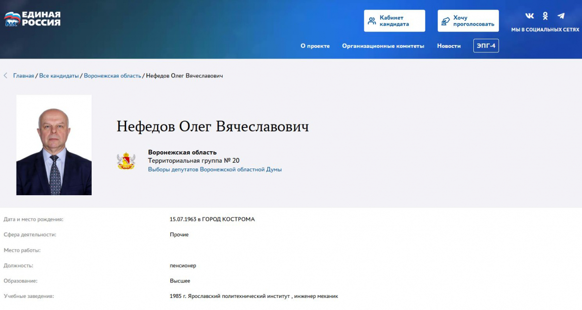 На праймериз «Единой России» выдвинулся экс-глава УФСБ по Воронежской области Олег Вячеславович Нефедов. Он руководил силовым ведомством по региону в период с 2015 по 2022 годы. Затем ушел на пенсию. На праймериз Олег Вячеславович идет, чтобы стать кандидатом в депутаты Воронежской областной Думы. На предварительное голосование Нефедов идет по территориальной группе №20. Она включает в себя Новоусманский район.