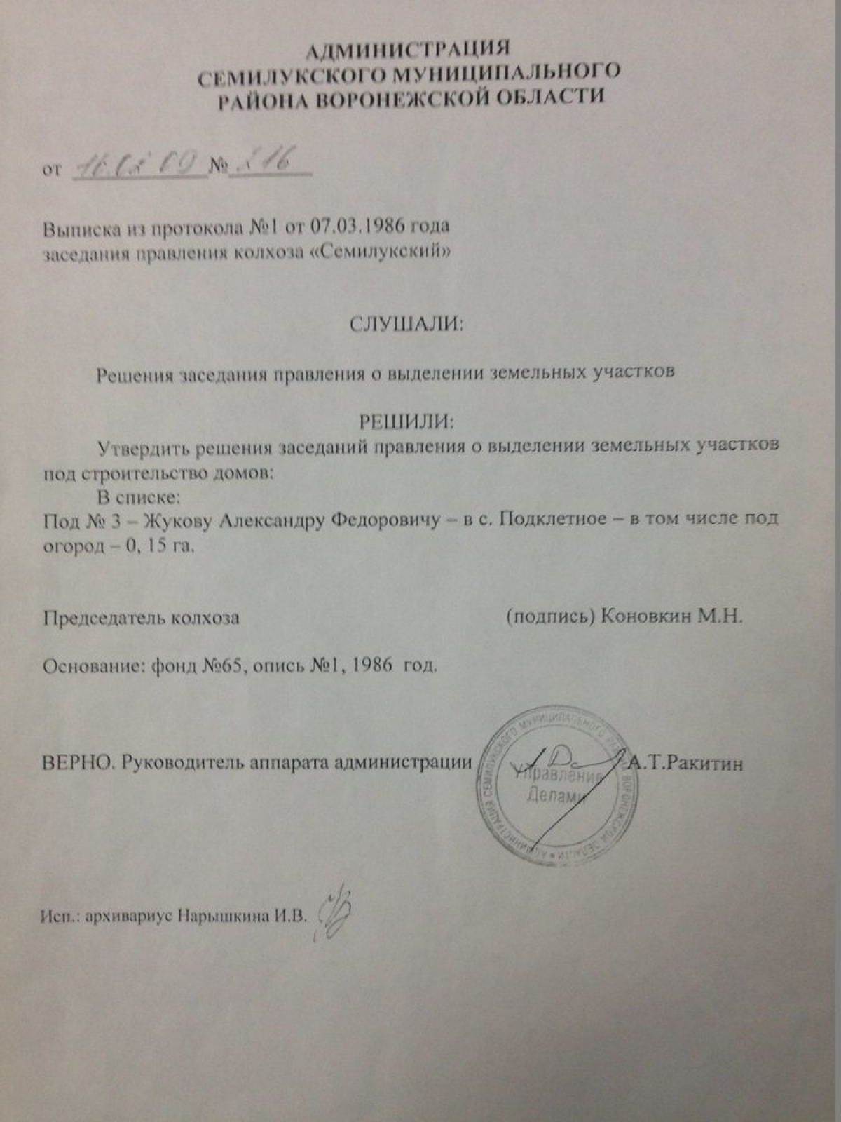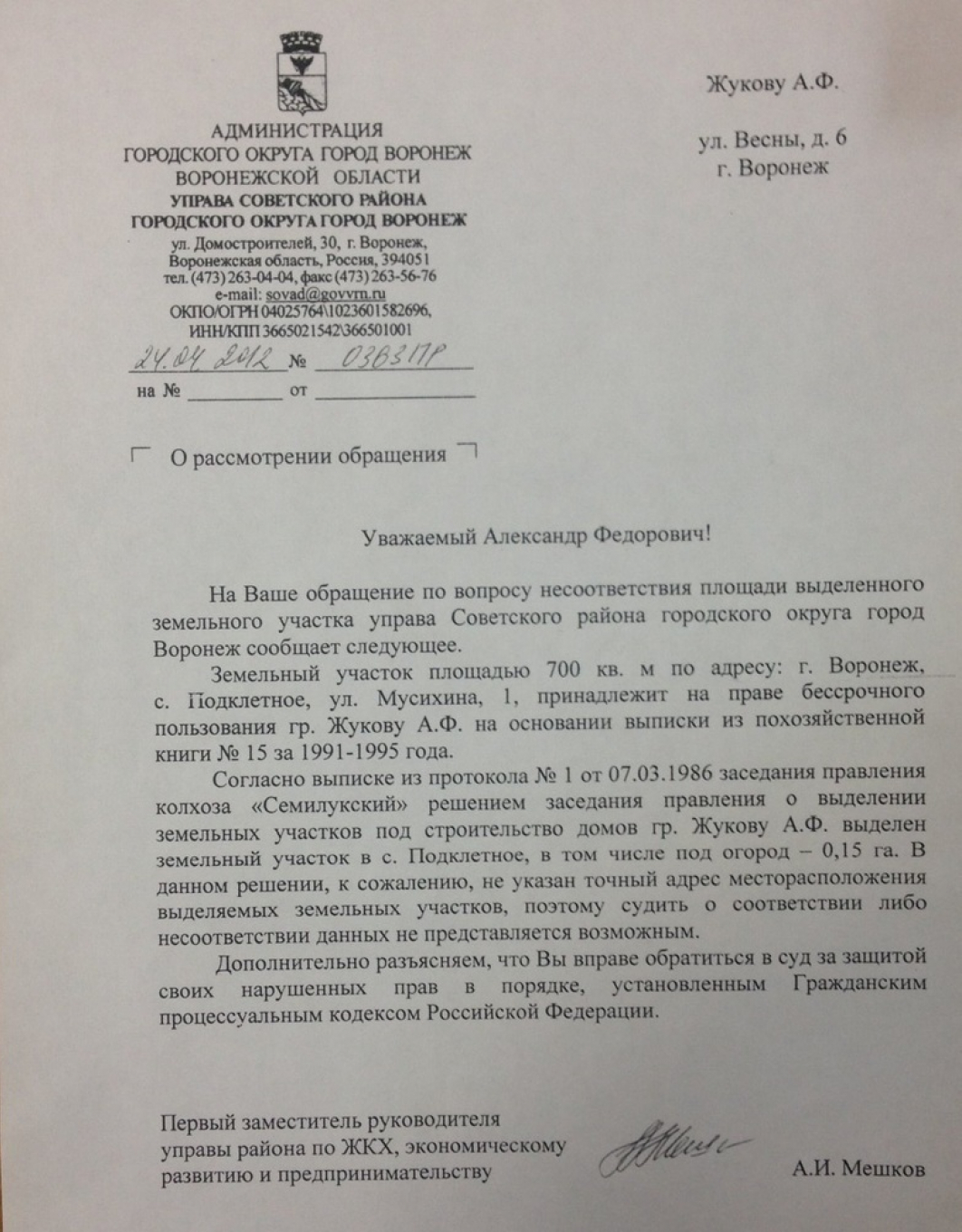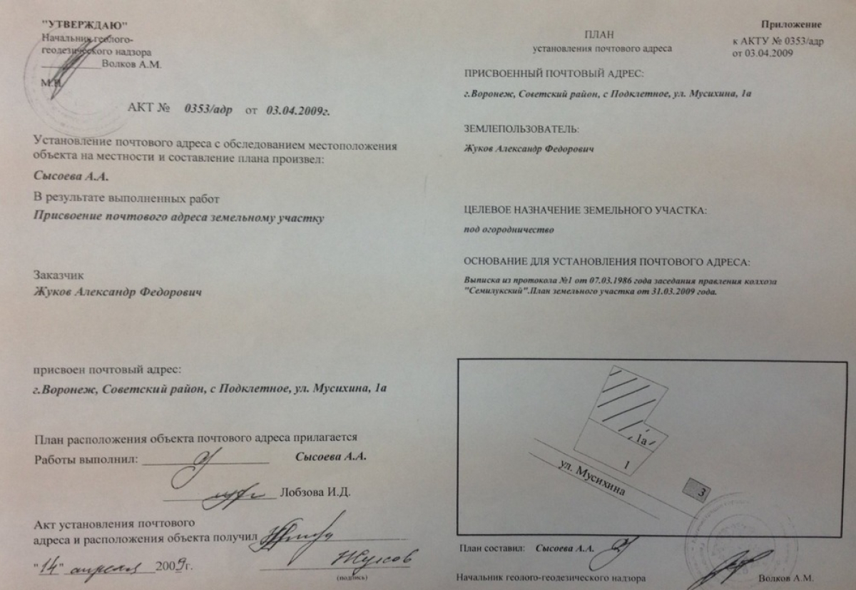 Антон Шевелев закрыл глаза на работу своего подчиненного Алексея Волкова, который в 2009 году утвердил план установления почтового адреса земельного участка. Ему был присвоен адрес: Воронеж, село Подклетное, улица Мусихина, 1а. В документе было написано, что землепользователь — Александр Жуков.