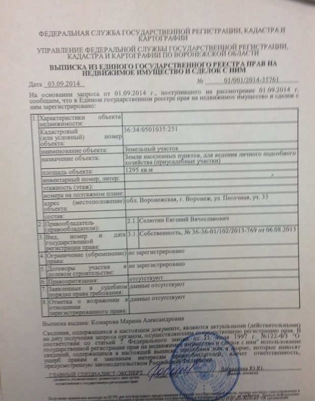Недавно Александр Жуков взял выписку из единого госреестра. В документе в графе» вид, номер и дата госрегистрации права» было написано: 6 августа 2013 года. Правообладателем значился cын главы Подклетного Евгений Селютин. Адрес у участка уже был не улица Мусихина, а Песочная.