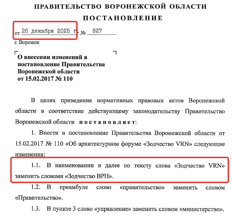 Также внесены соответствующие изменения в название постановления облправительства от февраля 2017 года «Об архитектурном форуме ««Зодчество VRN». В частности, один из пунктов этого «рядового документа» теперь выглядит так: «Архитектурный форум «Зодчество ВРН» - ежегодное отраслевое событие для профессиональных сообществ и жителей Воронежской области и иных субъектов Российской Федерации, состоящее из мероприятий образовательно-деловой программы и конкурсной программы в области архитектурной и градостроительной деятельности….».