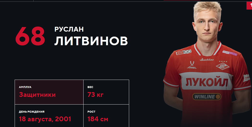 На сайте московского «Спартака» опубликована такая информация о 24-летнем спортсмене: он дебютировал за основную команду 21 октября 2020 года в матче против «Енисея» (0:1). Руслан Литвинов - первый футболист в истории клуба, родившийся в 21-м веке и сыгравший больше 100 матчей за «Спартак».