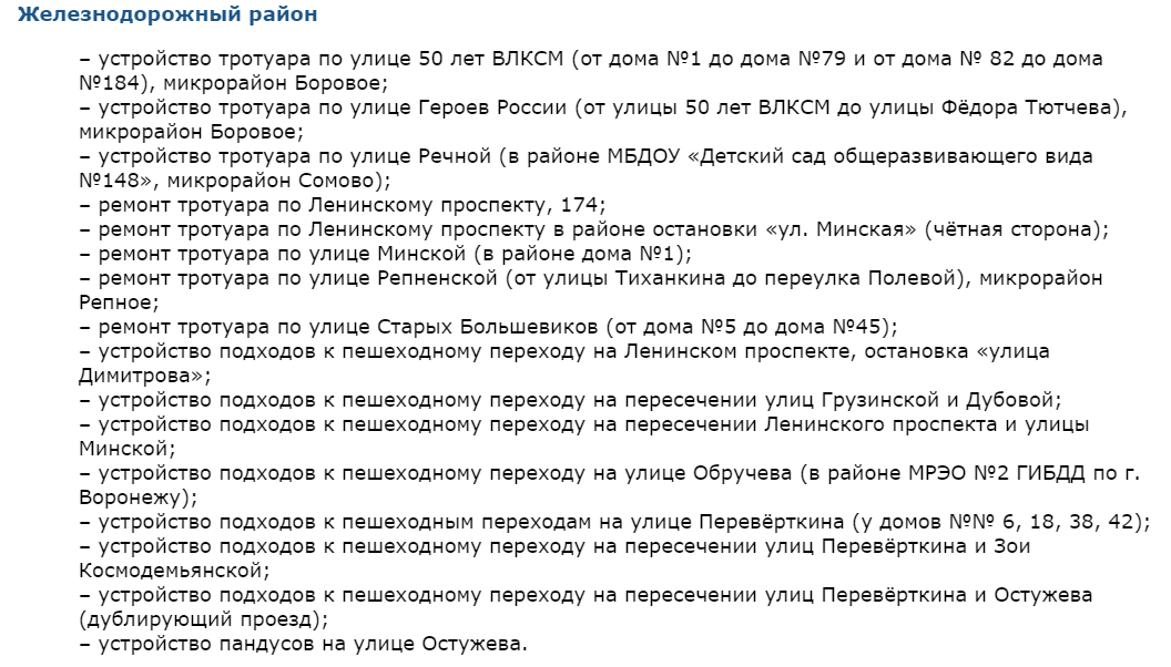 Ниже «Блокнот Воронеж» публикует подробный список адресов, где будут отремонтированы и построены тротуары в текущем году.