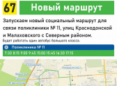 С 12 января в Воронеже начал работу новый автобусный маршрут №67, который называют социальным. Он связывает поликлинику №11 на улице Машиностроителей с Северным микрорайоном города. На направлении работает всего один автобус большого класса, ходит он по расписанию (начиная с 7:30).