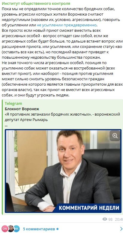 После этого ответа мнение депутата отчасти поддержал Институт общественного контроля. В организации заявили, что проводить эвтаназию в Воронеже пока преждевременно. Дело в том, что пока не определено точное количество бездомных собак. Особенно тех, которые проявляют немотивированную агрессию. Да и эвтаназия не станет панацеей.