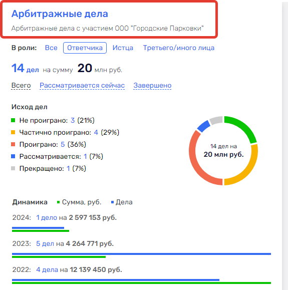 Стоит отметь, что белгородский концессионер концессионер регулярно проигрывает дела в судах: за последнее три года из 14 дел в качестве ответчика ООО «Городские парковки» выиграли только три, остальные проиграли или частично проиграли. Это свидетельствует о многочисленных нарушениях в работе ООО "Городские парковки", которые официально признаны в решениях судебных органов.