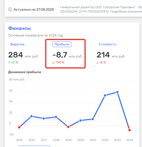 скриншот из открытых данных ООО "Городские парковки" и финансовой деятельности организации в 2024 году