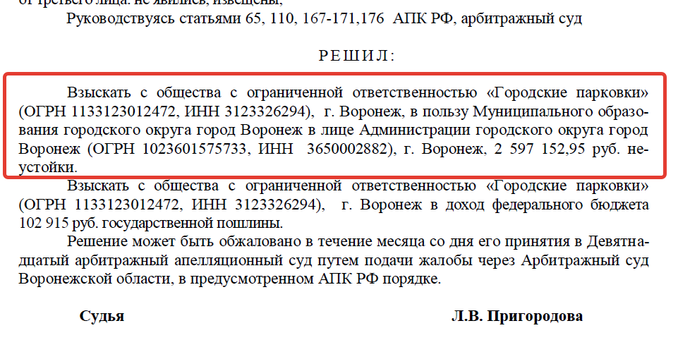 После чего мэрия подала очередной иск в Арбитражный суд на действия (бездействия) своего партнера – концессионера из Белгорода ООО «Городские парковки». В качестве третьего лица в деле было привлечена воронежская дорожная организация ООО «СК-Баев. Дело рассматривалось в суде почти 10 месяцев. Накануне было опубликовано результативная часть решения суда первой инстанции, оно может быть обжаловано в течение месяца.
