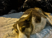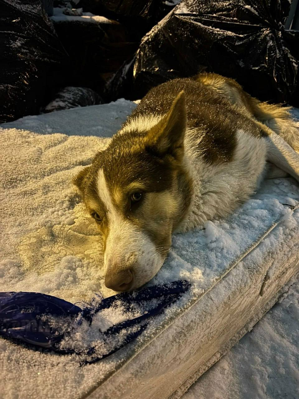 Зимой местные жители обнаружили собаку по кличке Амур прямо на мусорной площадке. Пёс лежал на старом матрасе среди выброшенных вещей, предположительно, его оставили там прежние хозяева во время переезда.