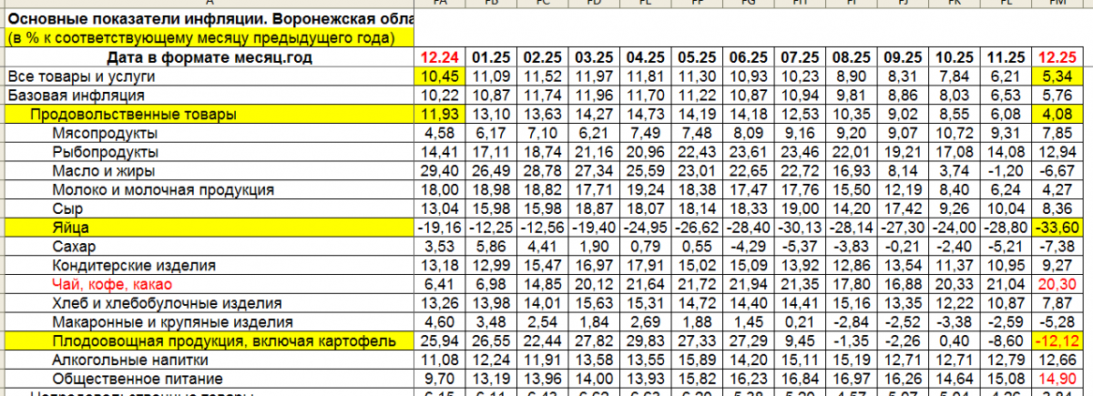 Регулятор отмечает, что цены в Воронежской области в декабре 2025 года выросли на 0,20 процента к ноябрю, а в целом годовая инфляция продолжает замедляться.