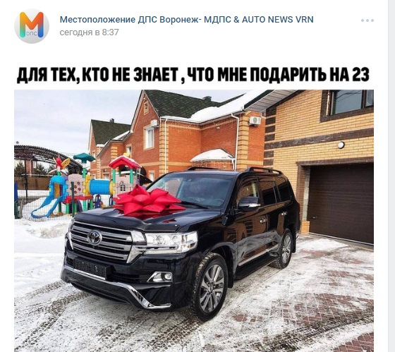 Приближением Дня защитника Отечества сильная половина человечества начинает мечтать о предстоящих подарках. Так, воронежские автомобилисты в одном из популярных пабликов показали, какой презент на 23 февраля они считают лучшим. На снимке была изображена Toyota Land Cruiser 200 Excalibur, перевязанная бантиком. Именно этот автомобиль воронежские водители считают идеальным подарком.