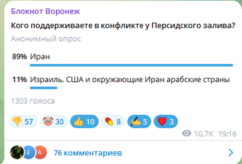 Редакция «Блокнот Воронеж» на своих ресурсах запустила опрос, чтобы выяснить на чьей стороне находятся симпатий жителей города в контексте войны между странами Персидского залива. Участников прямых, косвенных и даже случайных там много, но в целом можно сказать, что Иран вступил в схватку с коалицией из Соединенных Штатов, Израиля и ряда арабских стран.