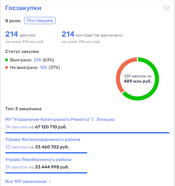 При чем только в трех случаях в торгах участвовали две организации, но каждый раз победителем объявлялось именно ООО «Чемпион Центр» с Наталией Хван. В остальных восьми торгах в 2025 году эта организация была единственным участником и каждый раз именно с ней заказчики (в 7 случаях это Управы Железнодорожного и Левобережного районов) подписывали муниципальные контракты.