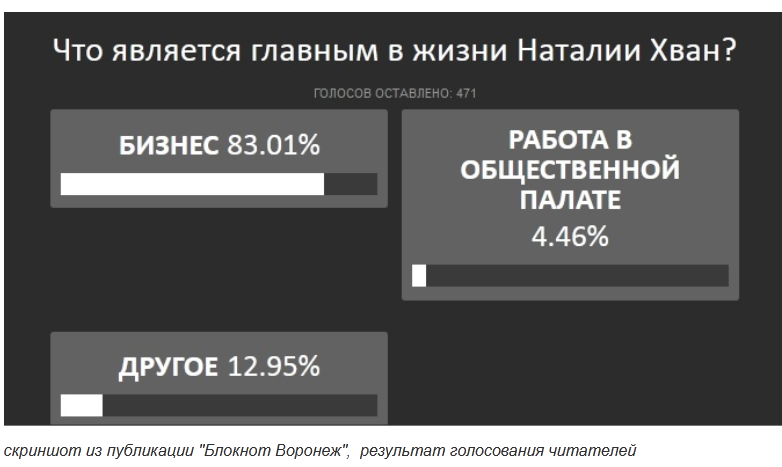 Согласно открытым данным, в организации, где Наталия Хван является управляющим – индивидуальным предпринимателем, работал один сотрудник, у него среднемесячная зарплата была почти 47 тысяч рублей. В то время как начисленная среднемесячная зарплата на одного работника в прошлом году была в областном центре, по данным Воронежстата, 85,8 тысяч рублей. Нынешний председатель региональной ОП в качестве управляющего коммерческой организации повысила зарплату своему сотруднику почти на 10 процентов, тогда как в среднем по городу был отмечен рост показателя на 15,2 процента.
