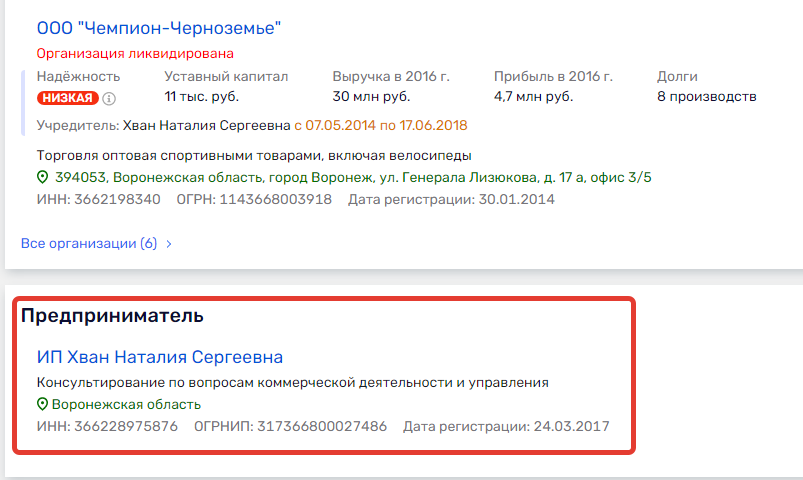 Стоит добавить, что по юридическому адресу ООО «Чемпион» зарегистрированы еще четыре организации. Это воронежская региональная общественная организация – ВРОО «Поддержки семьи», где с 2013 года руководителем является Наталия Хван, ВРОО «Объединение корейцев», возглавляет Александр Хван, ООО «Диамант Каприо», где руководителем числится уже Владимир Хван, и ООО «Чемпион Центр», там управляющим является Наталия Хван, а собственником – Владимир Хван.