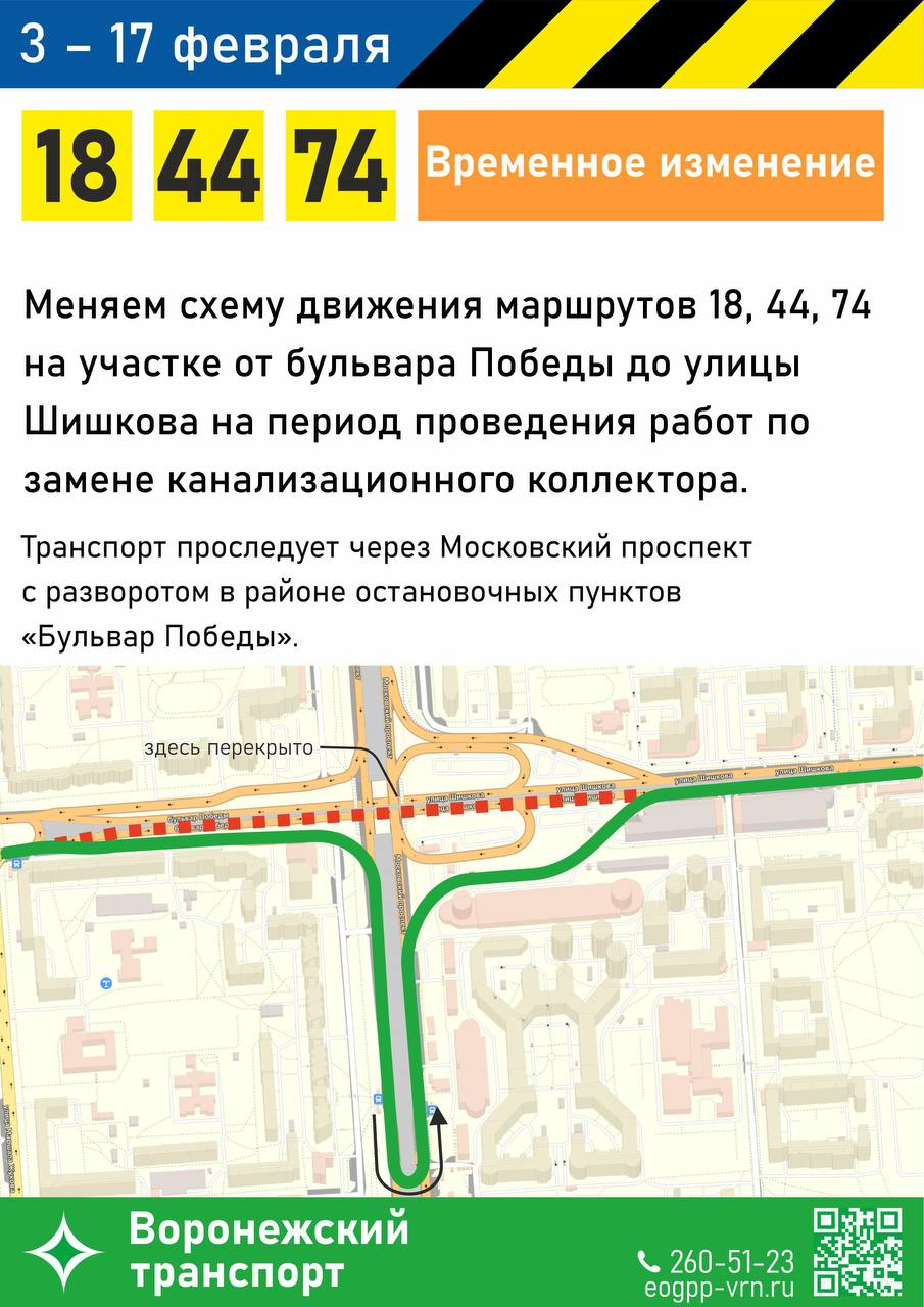 Они будут следовать с бульвара Победы по его дублеру, Московскому проспекту, улице Шишкова и далее по маршрутам, добавили в воронежском управлении транспорта.