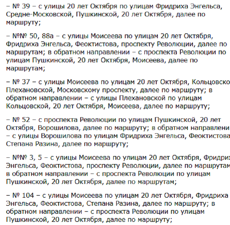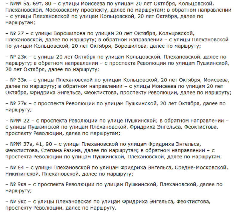 Что касается запрета на движение машин, то 22 июня, с 9.00 до 13.00, нельзя будет ездить по площади Ленина (от ул. Платонова до ул. Плехановской и от проспекта Революции до ул. Кирова), улице Плехановской (от дома №15 на пл. Ленина до ул. Пушкинской), Театральному проезду (от пл. Ленина до ул. Пушкинской).