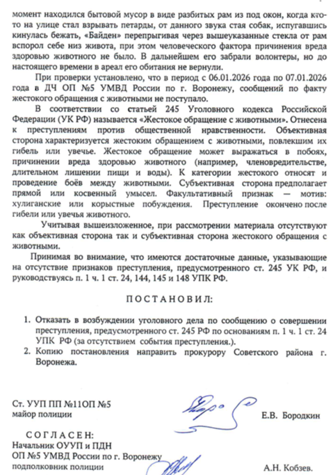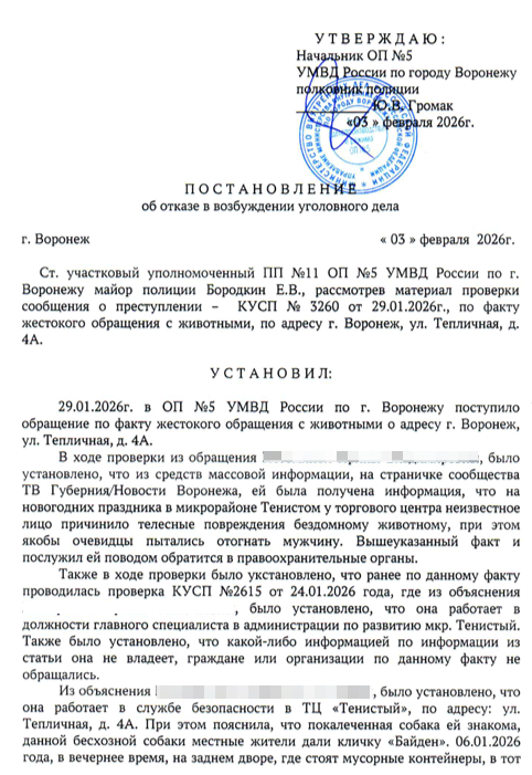 В конце января 2026 года жители воронежского микрорайона Тенистый обсуждали вопиющий случай, как бездомному псу, которого прозвали Байден, отрезали половой орган, якобы у этого есть очевидцы, и они даже пытались отогнать живодера. Люди рассказывали, что собака уже была кастрирована. Она была доброй, жила у торгового центра, неравнодушные подкармливали ее.