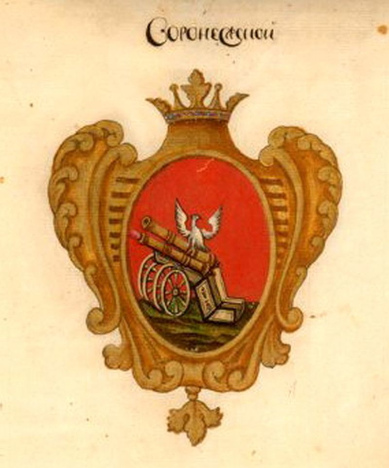 Во времена Петра Великого был разработан и первый официальный символ Воронежа. В его основе была положена эмблема пехотного полка нашего города. В золотом щите на червленом поле были изображены две медные пушки на стенках, из которых на одной сидел белый одноглавый орел. Под пушками земля была зеленой.