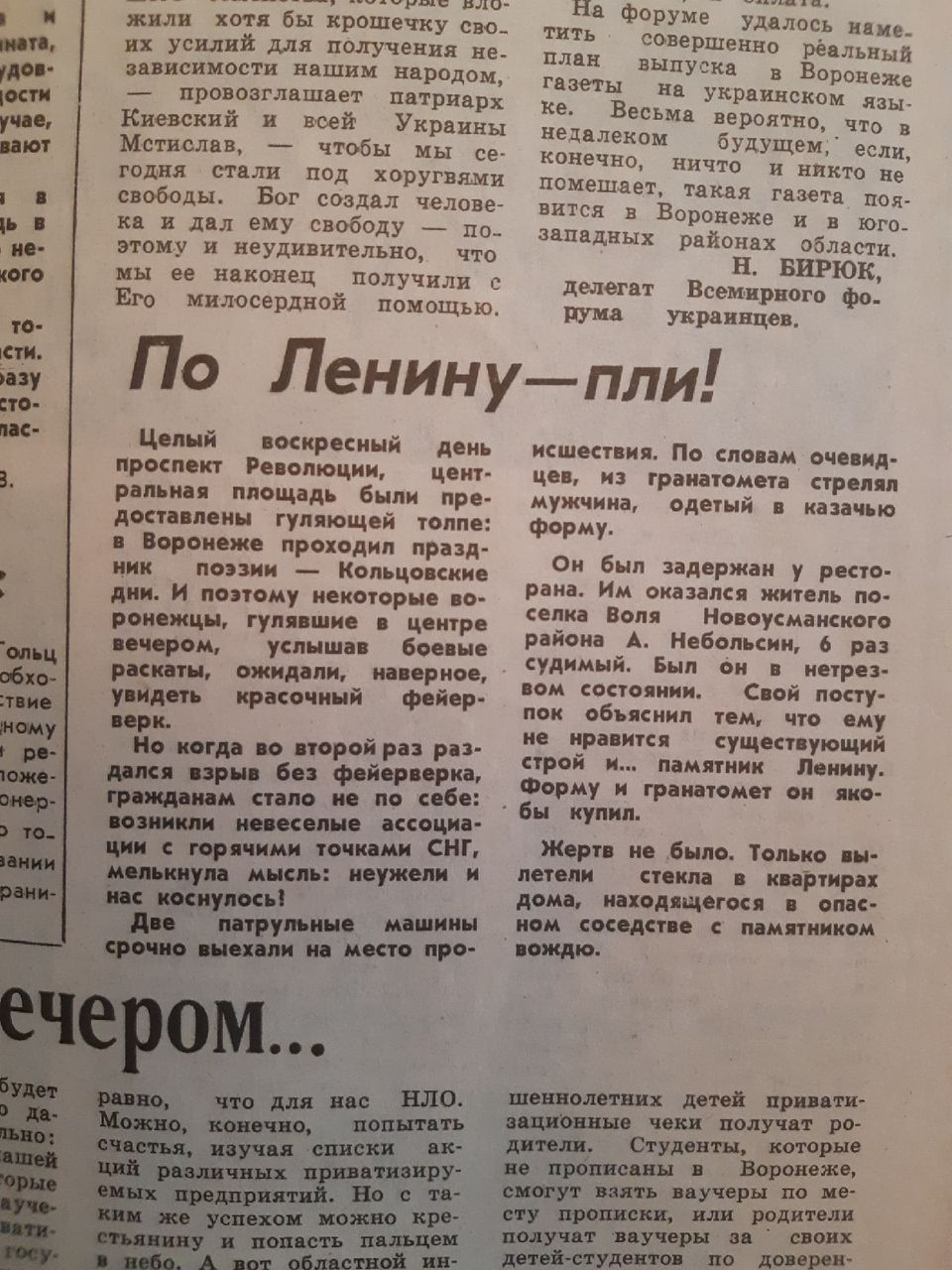 Осталось несколько дней до годовщины происшествия в центре Воронежа, когда казак из гранатомета расстреливал памятник Владимиру Ильичу Ленину. Об этом случае в 1992 году писала молодежная газета «Утро». Выходка казака омрачила проходящие в то время поэтические Кольцовские дни. По случаю того культурного форума в столице Черноземья организовывались народные гуляния. Люди собрались в Кольцовском сквере, где читали друг другу стихи. В какой-то момент воронежцы услышали огнестрельные залпы. Сначала боевые раскаты приняли за праздничный фейерверк. Однако, когда второй раз раздался взрыв без раскатов, то горожанам стало не по себе. «Возникли невеселые ассоциации с горячими точками СНГ, мелькнула мысль: неужели и нас коснулось?» - писал автор в своей заметке.