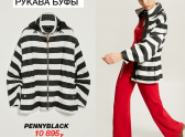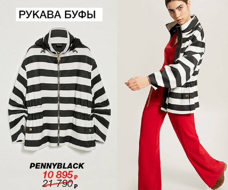 7. Куртка с контрастным рисунком. Самый неординарный и интересный вариант напоследок – куртка с контрастным рисунком и столь модными широкими рукавами-буфами от бренда Pennyblack. Черно-белые полоски создают необычную геометрическую иллюзию, а широкие рукава и игривые сборки на карманах куртки сделают образ более романтичным. Она понравится любителям необычных и авангардных вещей, обратит на себя взгляды и поможет вам быть в центре внимания.