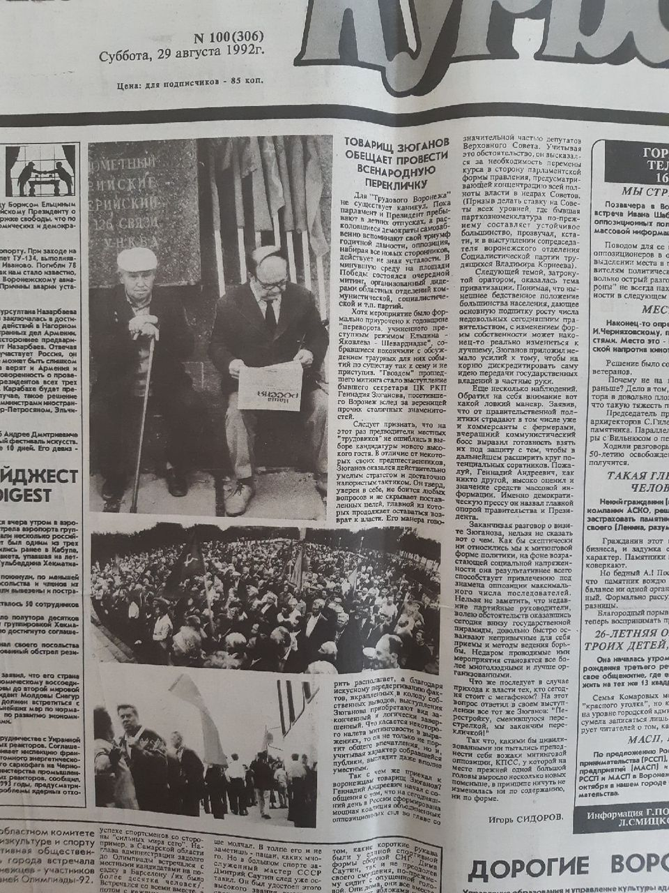 - Обратил на себя вот такой ловкий маневр. Заявив, что от правительственной политики страдают, в том числе уже, и коммерсанты с фермерами, вчерашний коммунистический босс выразил готовность взять их под защиту с тем, чтобы в дальнейшем расширить круг потенциальных соратников. Пожалуй, Геннадий Андреевич, как никто другой, высоко оценил и значение средств массовой информации. Именно демократическую прессу он назвал главной опорой правительства и президента, - писал в 1992 году в «Воронежском курьере» журналист Игорь Сидоров.