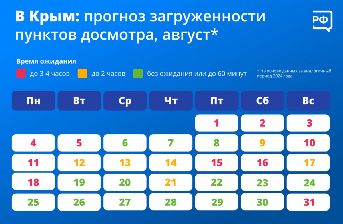 График на август туда и обратно зависит от конкретной даты. Здесь есть “желтые” и “красные” деньки, когда проехать будет сложнее всего. Напомним, что иногда очередь на Крымском мосту может быть огромной, а пробки затягиваться на несколько часов.