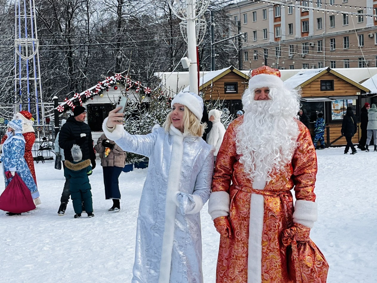Разодетые в красные шубы воронежцы вышли в город, не забыв взять с собой красавиц-Снегурочек.