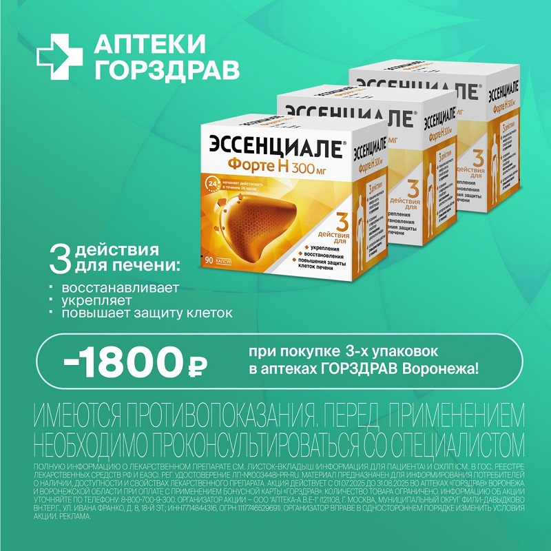 В аптеках «ГОРЗДРАВ» Воронежа вы можете приобрести «Эссенциале® форте Н» по выгодной цене до конца лета!