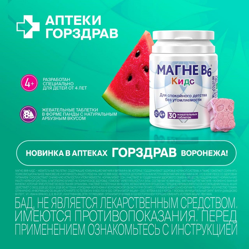 Поэтому сообщаем, что в сеть аптек ГОРЗДРАВ поступила новинка – комплекс «Магне В6 Кидс». Это жевательные таблетки с комбинацией из магния и витамина В6, которые поддерживают здоровье нервной системы, а также помогают сохранять психоэмоциональное равновесие и активность вашего ребенка. Жевательные таблетки содержат органическую соль магния – цитрат, который помогает восполнить потребность организма в этом макроэлементе, а витамин B6 улучшает его усвоение.