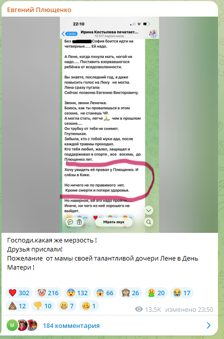 Последнее (пока последнее) упоминание Ирины со стороны Плющенко - это реакция на ее пост, где она пишет, что хочет увидеть провал дочери и ее слезы, словами.