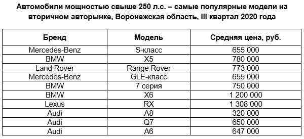 Самыми востребованными брендами авто в столице Черноземья стали BMW, Land Rover, Audi, Mercedes и Lexus. Средняя стоимость таких б/у машин с мощностью выше 250 л.с. в нашем регионе составила 755 тыс рублей, а ценник на авто меньшей мощностью варьируется в районе 255 тыс рублей.