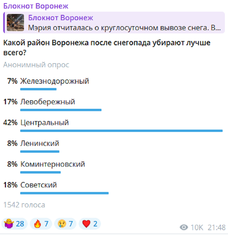 Вечером 28 декабря редакция «Блокнота» запустила в своем телеграм-канале опрос. Мы хотели выяснить, в какой части города коммунальщики лучше всего справляются со снегопадами. И собрали неплохую базу из 1542 мнений.