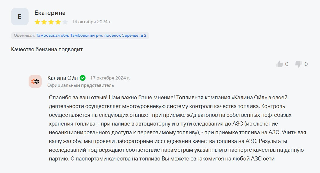 «Топливная компания «Калина Ойл» в своей деятельности осуществляет многоуровневую систему контроля качества топлива. Результаты исследований подтверждают соответствие параметрам указанным в паспорте качества на данную партию. С паспортами качества на топливо Вы можете ознакомится на любой АЗС сети».