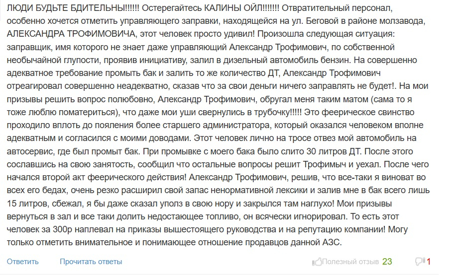 «ЛЮДИ БУДЬТЕ БДИТЕЛЬНЫ!!!!!! Остерегайтесь КАЛИНЫ ОЙЛ!!!!!!! Произошла следующая ситуация: заправщик, проявив инициативу, залил в дизельный автомобиль бензин. На совершенно адекватное требование промыть бак и залить то же количество ДТ, управляющий отреагировал совершенно неадекватно, сказав что за свои деньги ничего заправлять не будет!. Обругал меня таким матом (сама то я тоже люблю поматериться), что даже мои уши свернулись в трубочку!!!!!»